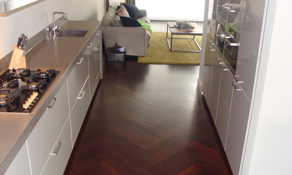 Tevreden klant in Heerhugowaard Deze woning in Heerhugowaard heeft Parketmeester Huot Denspark volledig voorzien van de stoffering. Op de begane grond is een Wengé Bourgogne Visgraat Parket geplaatst in het formaat 140x700mm. Om de uitstraling luxe maar modern te houden is gekozen voor een band rondom de vloer zonder een bies. De afwerking met een strakke hoge MDF-plint afgelakt in